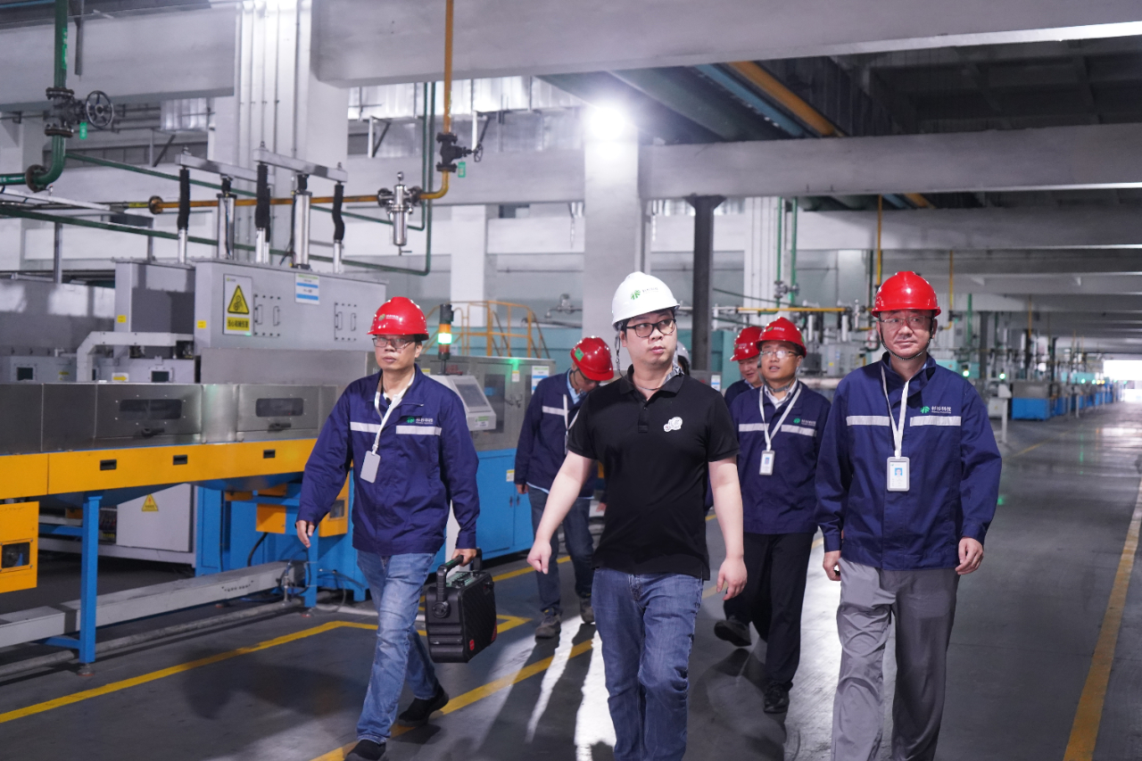 鄭駒深入車間了解產(chǎn)線建設(shè)、工藝流程。眉山基地負(fù)責(zé)人匯報(bào)各產(chǎn)線投產(chǎn)進(jìn)度及下半年生產(chǎn)經(jīng)營(yíng)目標(biāo)。