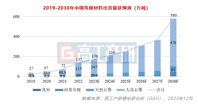 首先,從市場空間來看,面向TWh時代,負(fù)極材料市場仍具持續(xù)增長潛力。GGII預(yù)計,2030年我國負(fù)極材料出貨量有望達(dá)到580萬噸,其中人造石墨仍為市場主流,出貨量超470萬噸。