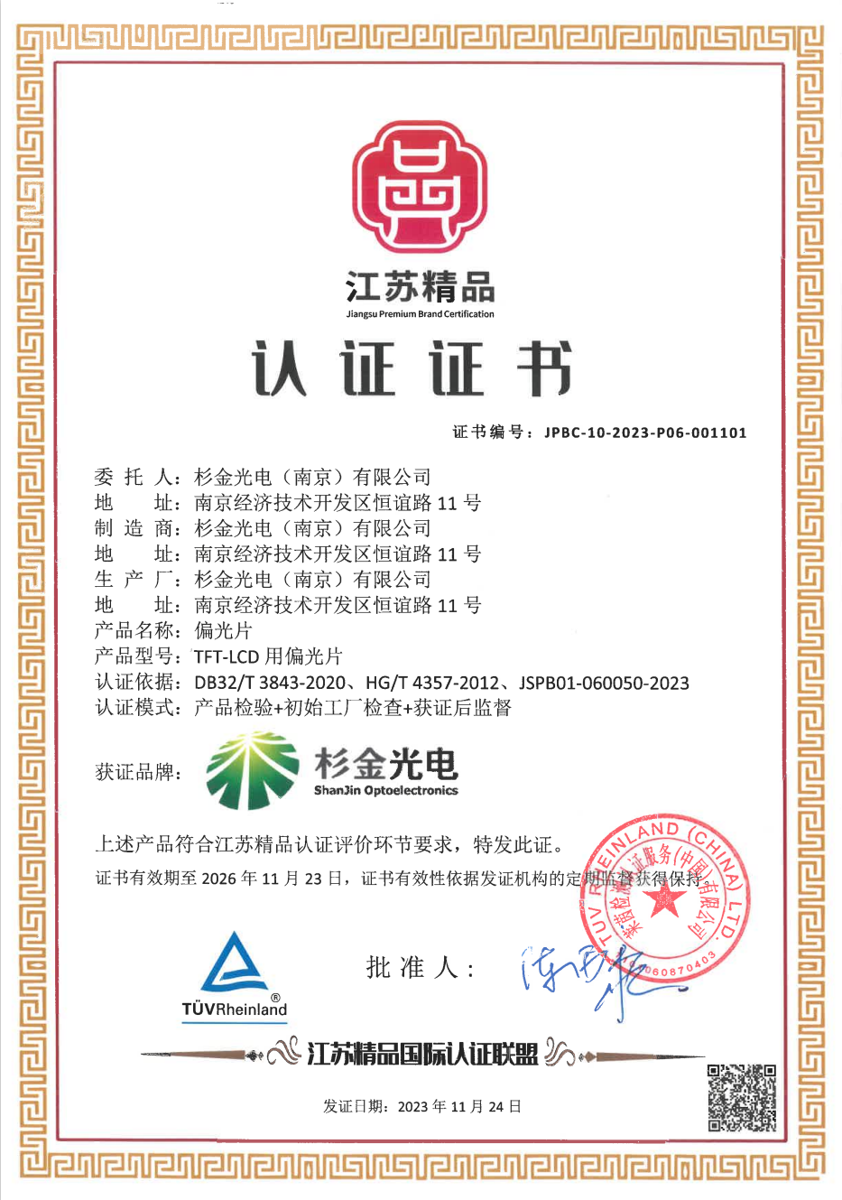 杉金光電自成立以來,一直致力于偏光片技術(shù)的研發(fā)和創(chuàng)新,憑借強(qiáng)大的技術(shù)實力和嚴(yán)格的質(zhì)量管理體系,為眾多客戶提供高品質(zhì)的產(chǎn)品和服務(wù)。此次榮獲“江蘇精品”認(rèn)證,不僅是對杉金光電過去努力的認(rèn)可,更是對公司未來發(fā)展的極大鼓舞。