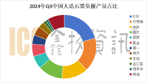 據(jù)ICC鑫欏資訊數(shù)據(jù)顯示,2024年Q3國內(nèi)人造石墨負(fù)極材料總產(chǎn)量約49萬噸,上海杉杉占比21%,憑借著領(lǐng)先的技術(shù)優(yōu)勢和市場地位,市占率仍居首位。