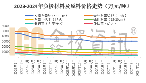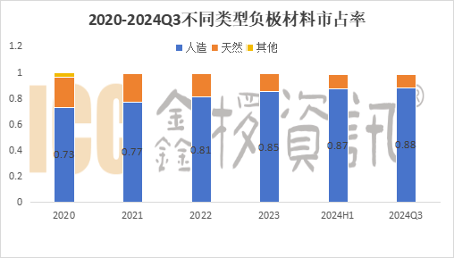 就材料類型來看,國內(nèi)人造石墨負(fù)極仍占據(jù)主流地位,人造負(fù)極占比不斷提升,2024年Q3占比達約88%,創(chuàng)歷史新高。