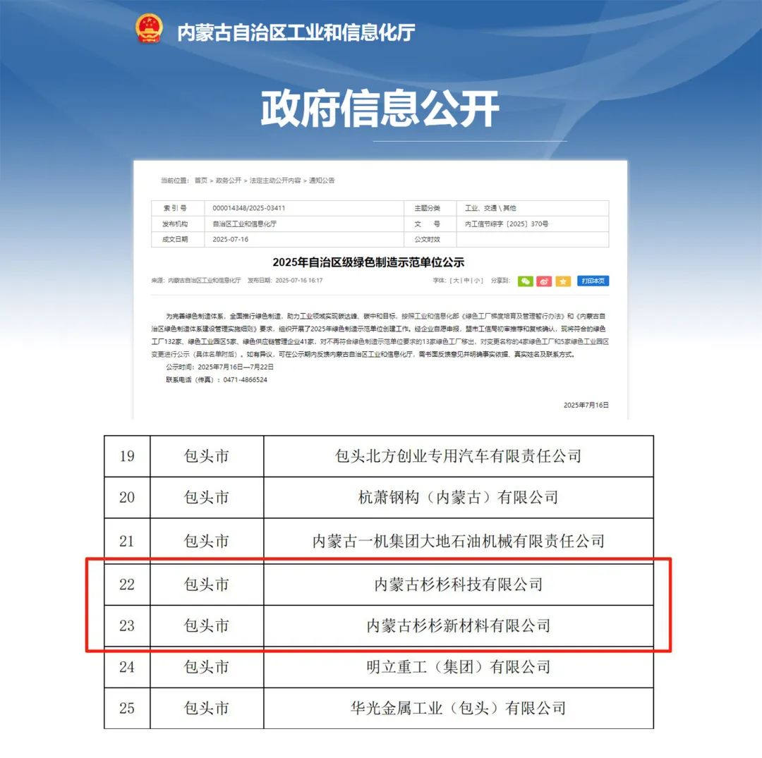 7月16日,內(nèi)蒙古自治區(qū)工業(yè)和信息化廳發(fā)布《2025年自治區(qū)級綠色制造示范單位公示》,內(nèi)蒙古杉杉科技有限公司及內(nèi)蒙古杉杉新材料有限公司成功獲評“綠色工廠”。標志著企業(yè)在履行環(huán)保社會責任方面獲得政府部門認可,也為地區(qū)完善綠色制造體系,助力實現(xiàn)“雙碳”目標作出貢獻。